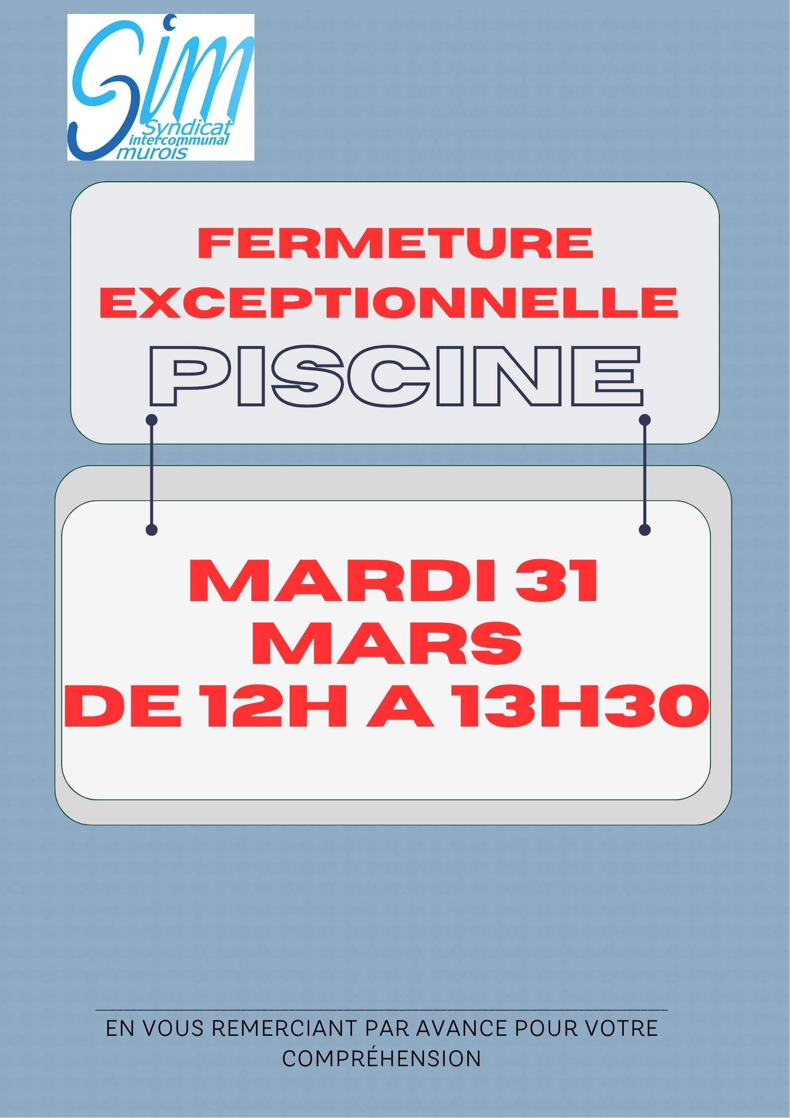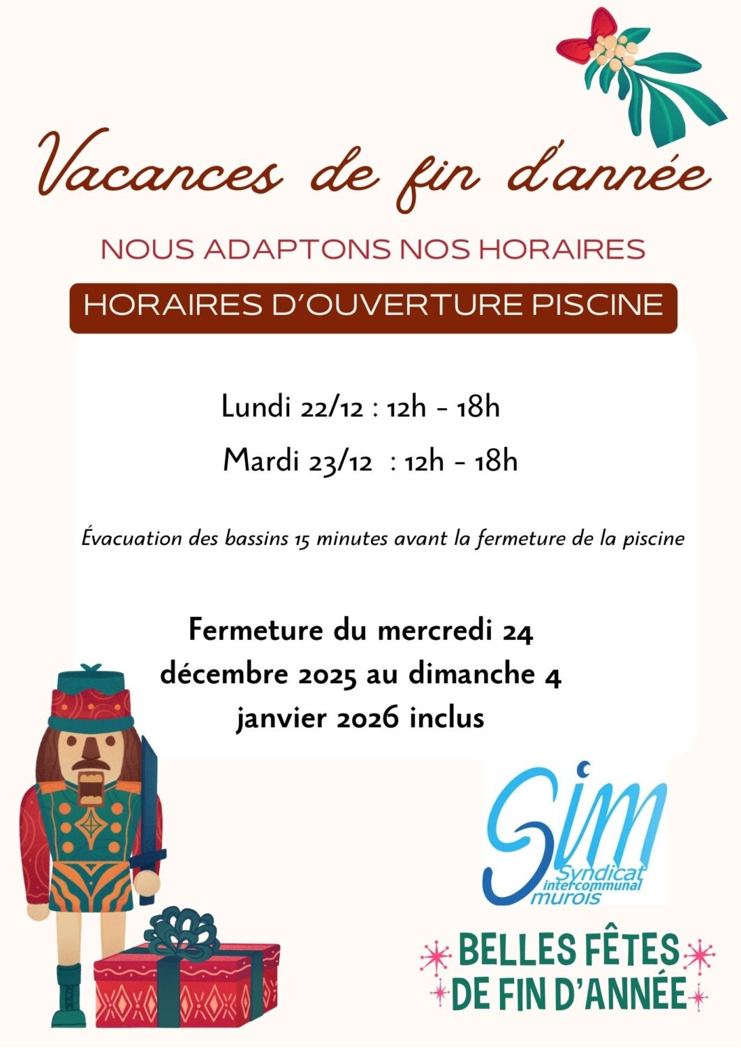La piscine fermera ses portes du mercredi 24 décembre 2025 inclus au dimanche 4 janvier 2026 inclus.